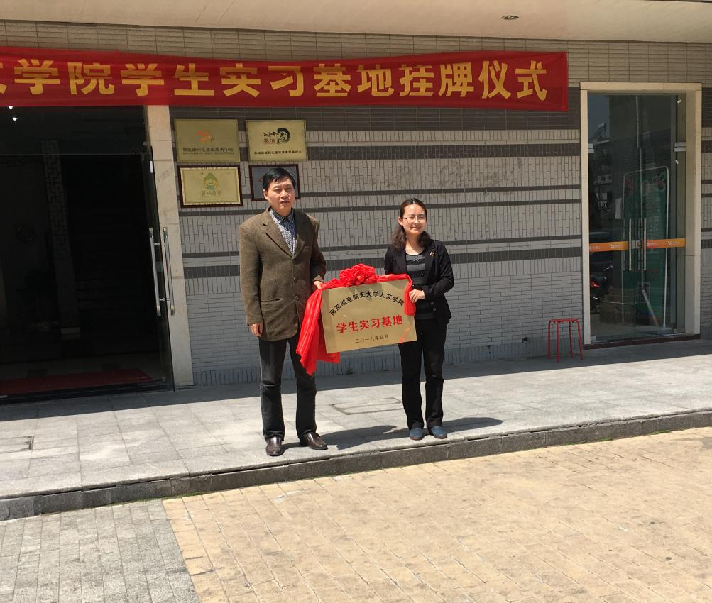 为加强学生社会实践活动建设,进一步推动人才培养计划,4月19日,百家乐官网 与秦虹康乐汇家庭服务中心联合举行了挂牌仪式,正式在秦淮区秦虹康乐汇家庭服务中心设立“南京航空航天大学人文学院学生实习基地”。学院副院长郑易平、秦虹街道办事处副主任陶莹莹、市民服务中心副主任夏传利、中心负责人许开飞、中心副主任唐晓平,学院沈广和老师及辅导员陈雷等出席了仪式。