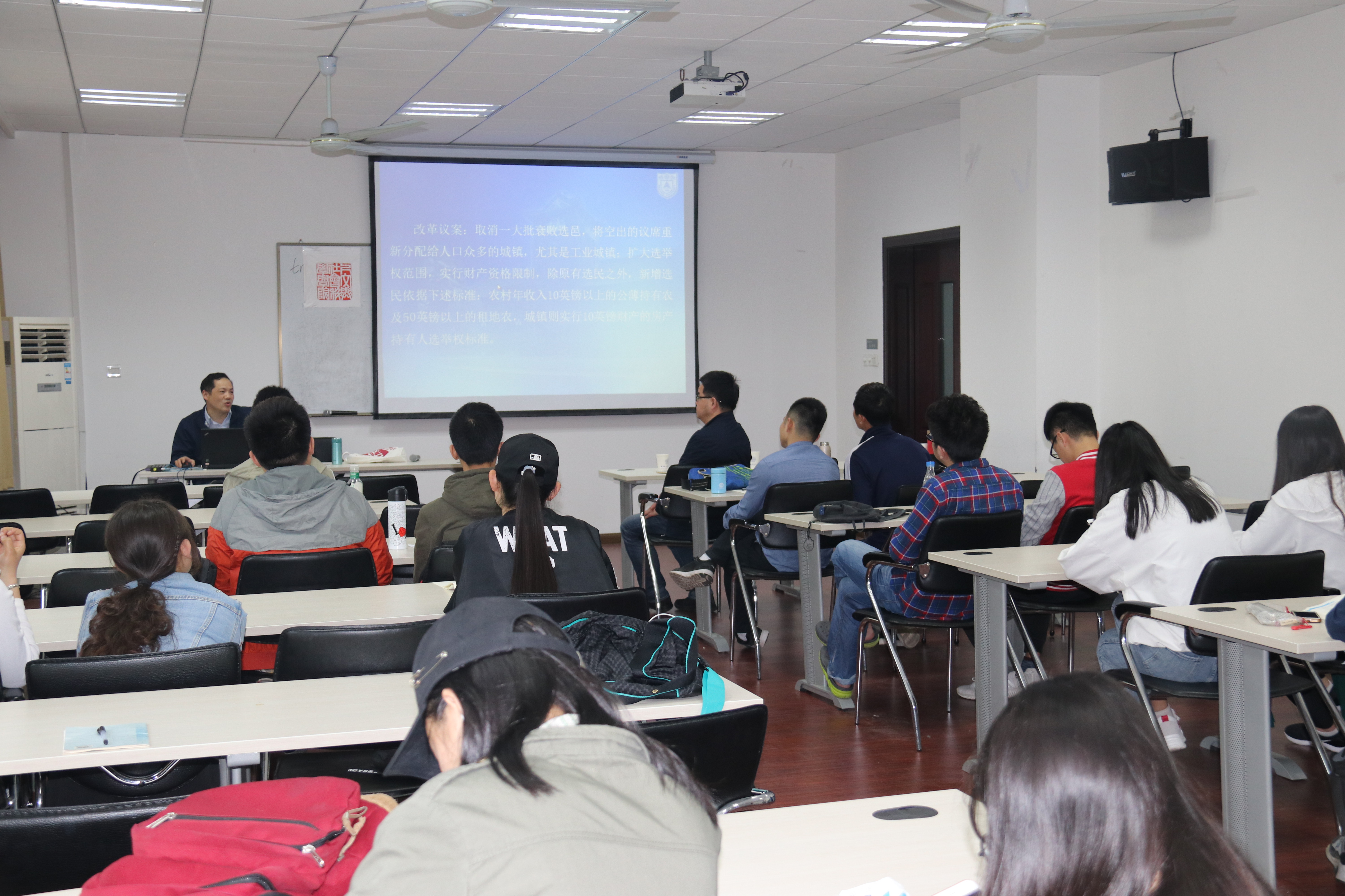 刘教授从本次讲座的主题入手,分别解释了“和平、渐进、改革”的含义,为了让同学们理解英国的行政划分,又详细解释了英国的含义及构成,指出了同学们一直存在的认知误区。刘教授详细解释了当今英国君主立宪制的政治框架,指出政治现代化的演进路径是从专制制度到寡头制度再到民主制度有,又讲解了政治现代化的内涵及其道路、英国政治现代化的源头以及英国政治现代化的特点和启示。讲座临近尾声,在场同学积极发问,与刘教授进行热烈探讨。最后,王院长再次代表学院感谢刘金源教授带来的精彩讲座,同时鼓励同学们借助人文大讲堂等平台,在科研和探索学术道路上主动有所惑、有所问、有所成。