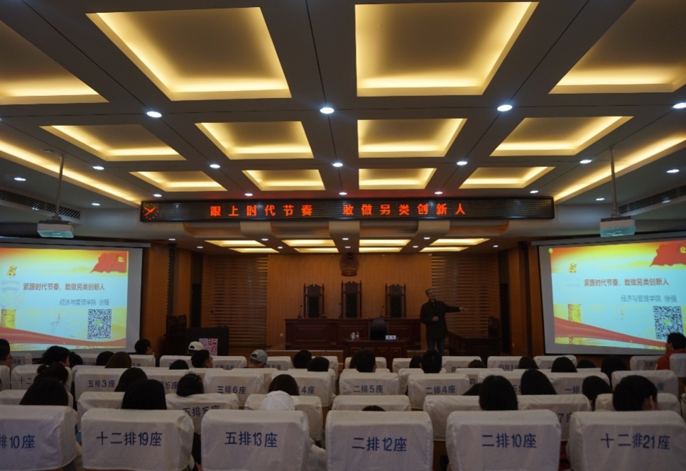 徐强教授首先结合专业背景向大家做了自我介绍,徐教授本科是地质学专业,毕业后从事了10年技术经济教学工作,1997年应聘到南航从事金融学研究工作。研究专业上的跨越式转变看似阻碍,实则成为了徐教授创新研究的动力。随后,徐教授由“什么是时代节奏?”“什么是时代的标志物?”“你害怕做另类吗?”三个问题展开交流,他对青年一辈提出了深切希望:紧跟时代节奏,明确奋斗目标;敢做另类创新人,训练发散思维和系统思维;克服功利心,学会顾及长远;认真做事,踏实做人。随后,徐强老师就在场师生提出的关于党建创新、教学创新、另类底线等问题进行了解答,并分享了自己在教学理念与方式上创新的经验。他认为创新不在于形式,更重要的是效果务实,无论是创新还是做人,都要严守底线,问心无愧,不愧社会。