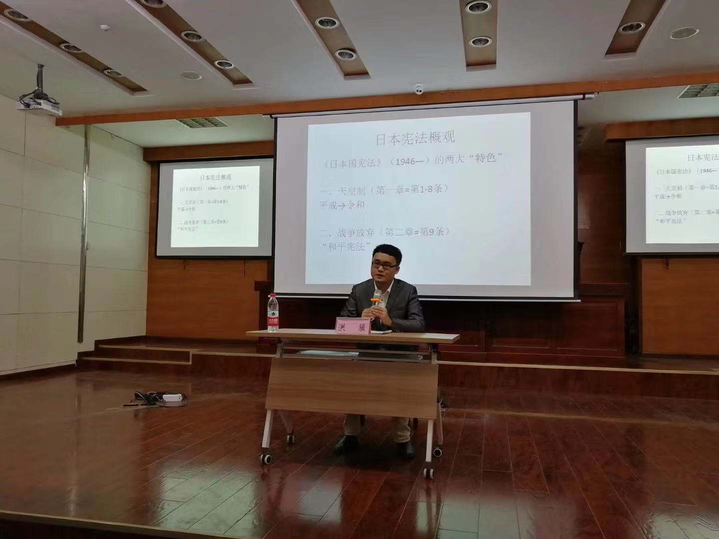 洪骥在开场寒暄中盛赞该论坛的名称(花津“法政”论坛),并从“法律与政治”的界限为切入点,阐述了近代文明国家的标志以及“法治”在应然状态中的内涵。接着,洪骥向师大法学院的同学们简单介绍了日本宪法的两大“特色”,即第一章“天皇制”与第二章“战争放弃”,并结合学生时代的切身体会漫谈了这两个领域在日本学界、政府以及民间的接受状况。